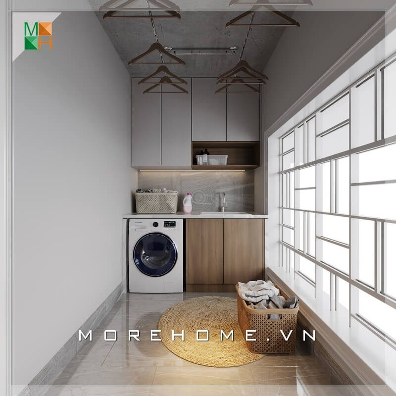 Khoảng không gian thoáng đãng được bố trí hệ thống tủ đựng hiện đại thuận tiện cho việc giặt và phơi quần áo