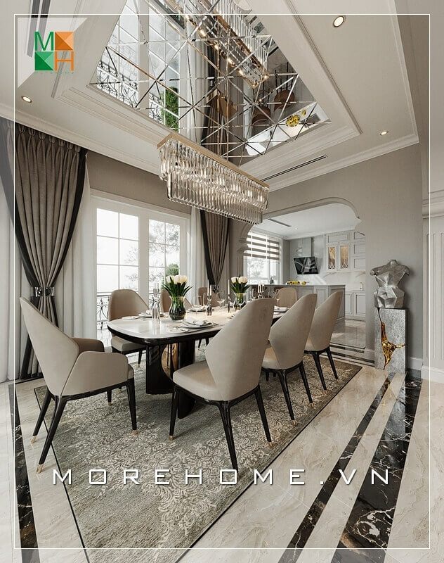 Nội thất phòng ăn của biệt thự, nhà phố sang trọng được thiết kế cao cấp với bộ bàn ghế 8 chỗ ngồi tiện nghi là tâm điểm của toàn bộ căn phòng.