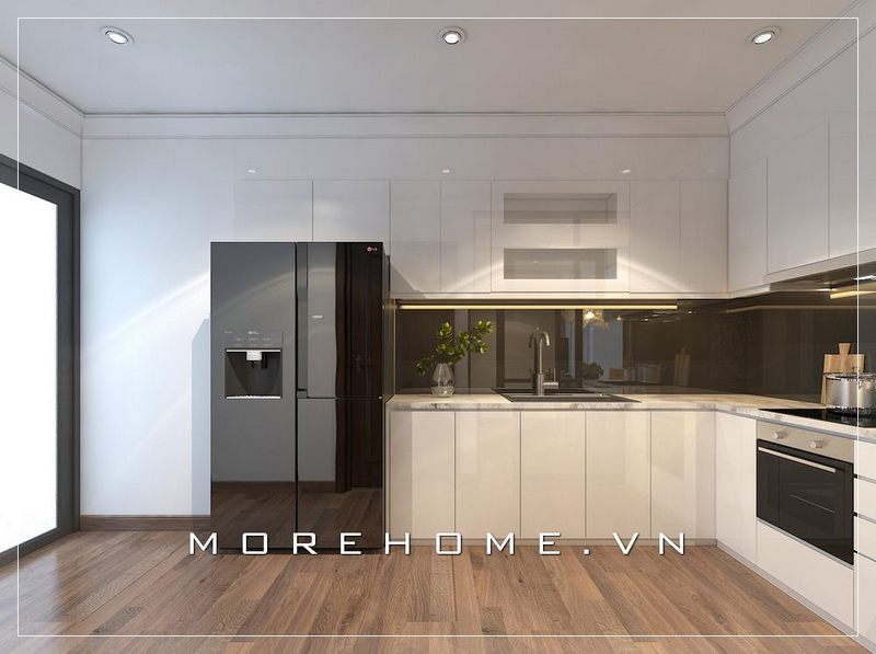 Căn phòng bếp gọn gàng sạch sẽ gam màu trắng tinh tế vô cùng tiện lợi cho gia chủ trong mọi sinh hoạt nấu nướng hàng ngày.