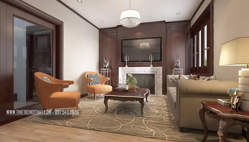 Sofa phòng khách được thiết kế bằng gỗ óc chó kết hợp với bọc nỉ màu nâu sang trọng để tạo nên một phong cách biệt thự tân cổ điển.