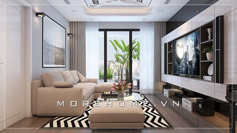 Mẫu sofa phòng khách hiện đại được trang bị bằng tone màu nâu ấm cúng và sang trọng giúp tạo nên một không gian thân thiện trong phòng khách chung cư.